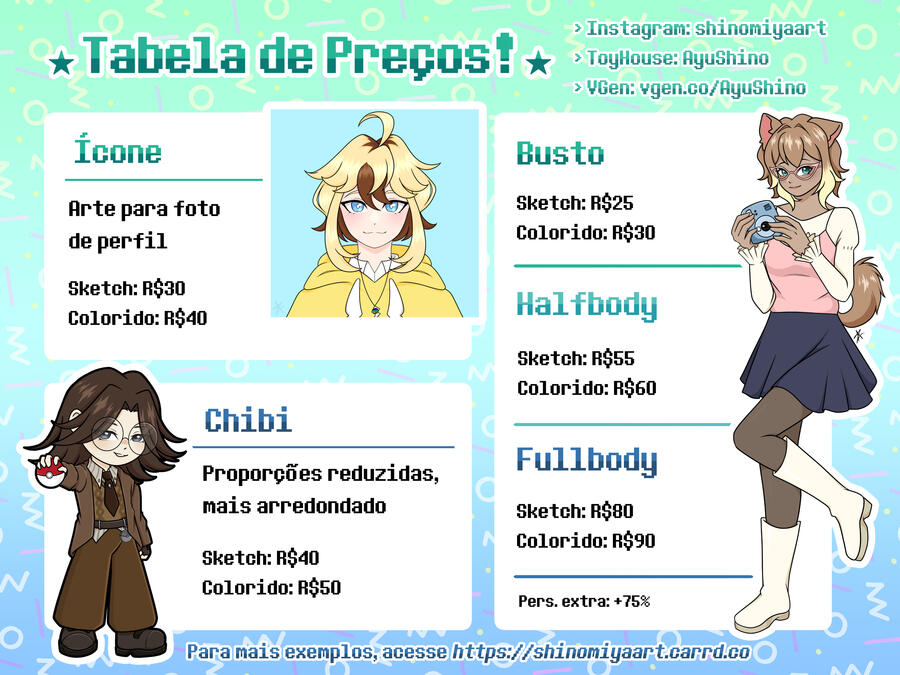 ⋆ Adicionais: acréscimo por designs complicados, detalhes extras ou fundo complexo, a negociar⋆ Personagem extra: +75%